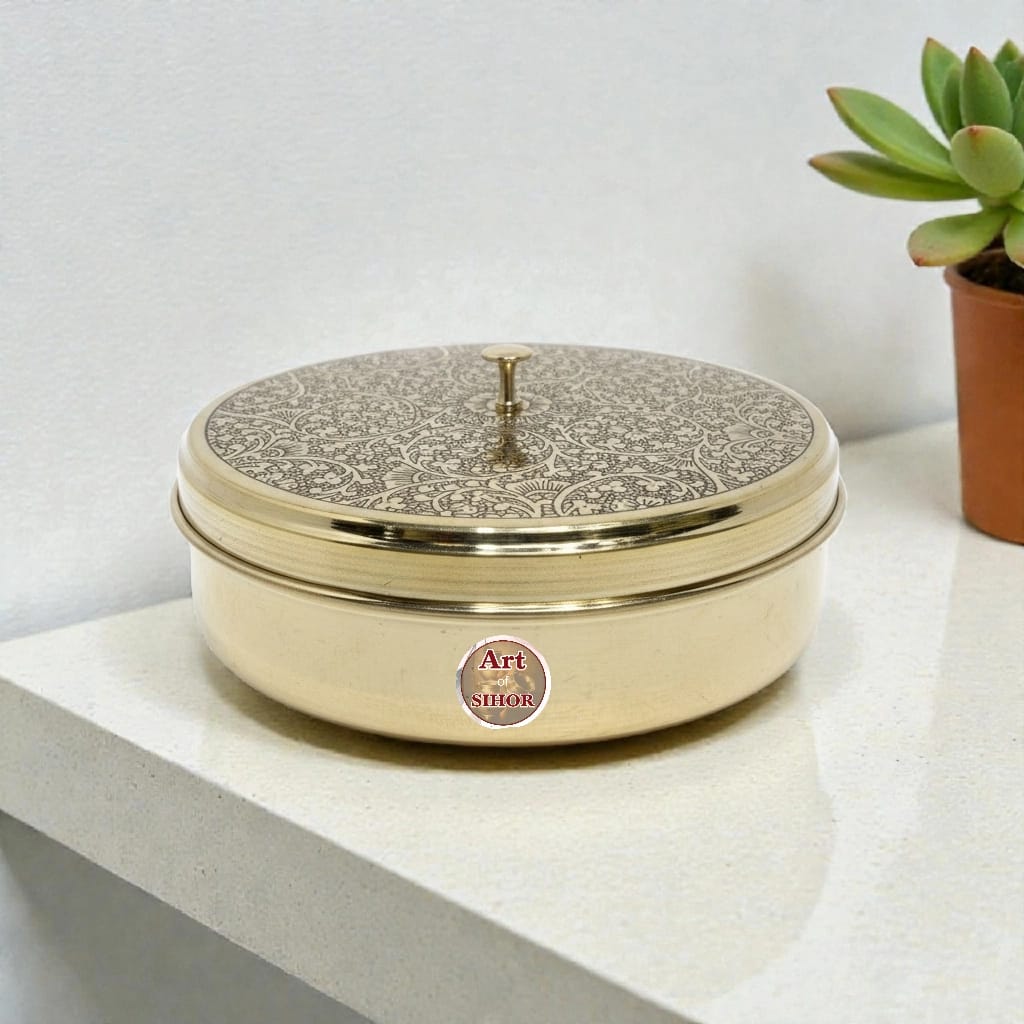 • Bring home the charm of traditional Indian craftsmanship with this beautifully engraved Brass Dabba. Designed with intricate floral patterns and finished in a rich antique golden polish, this premium dabba reflects elegance, heritage, and durability in every detail.