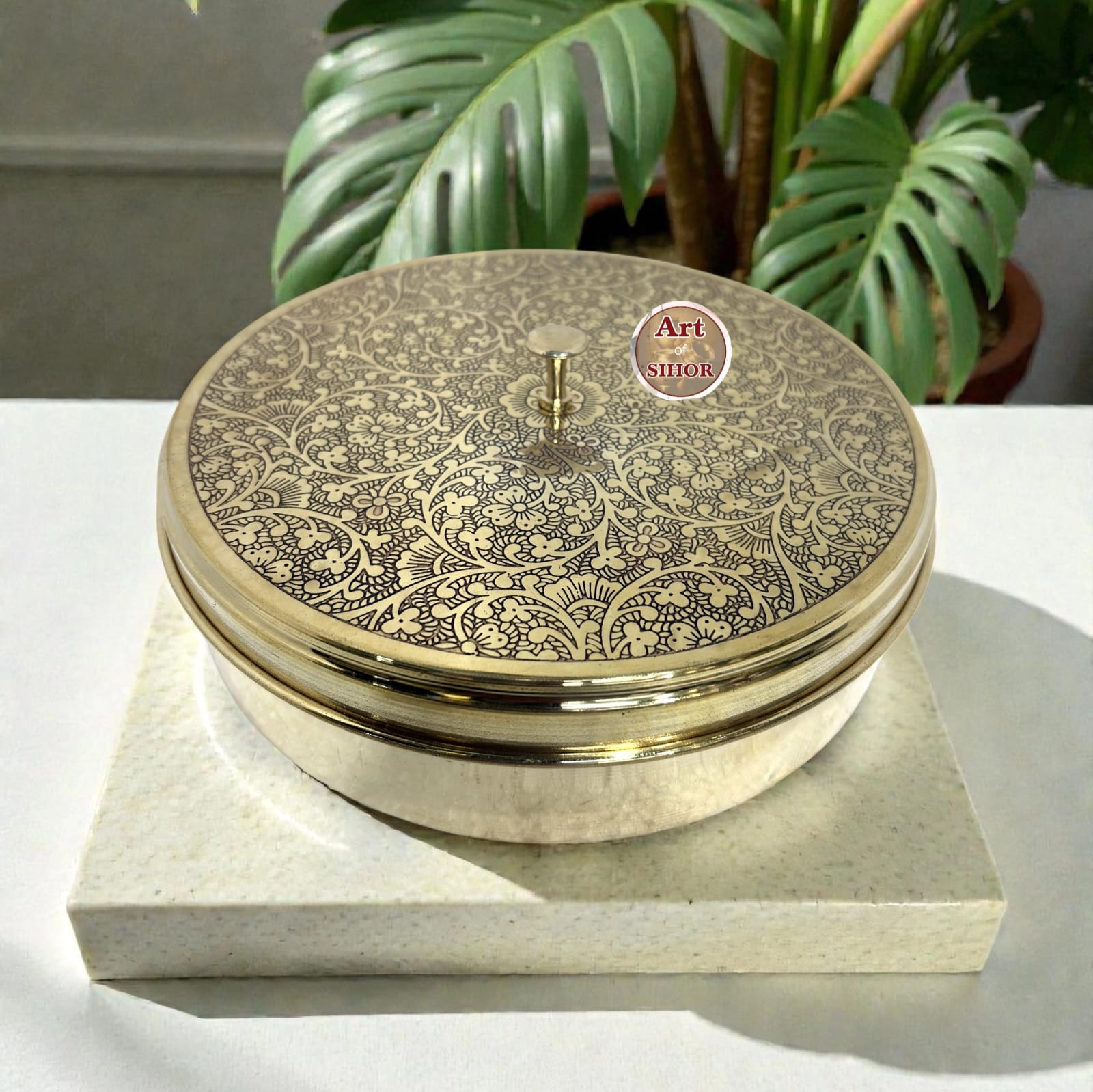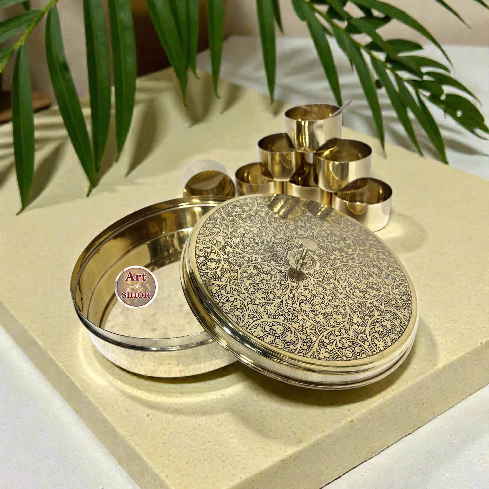 • Upgrade your space with this premium engraved brass dabba, where timeless Indian craftsmanship meets modern luxury. Designed with intricate floral carving and finished in a rich antique gold tone, this piece instantly adds elegance to your home, pooja room, or gifting collection.